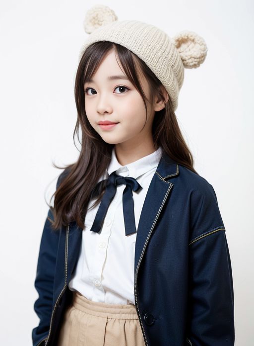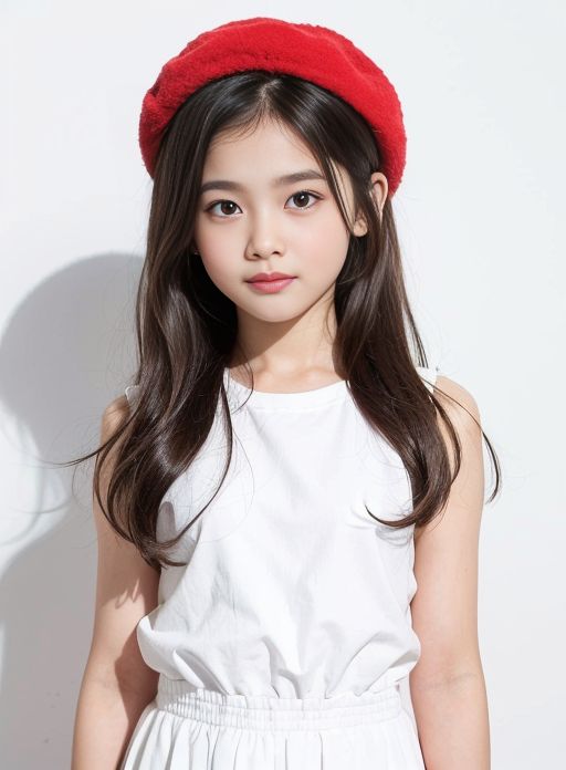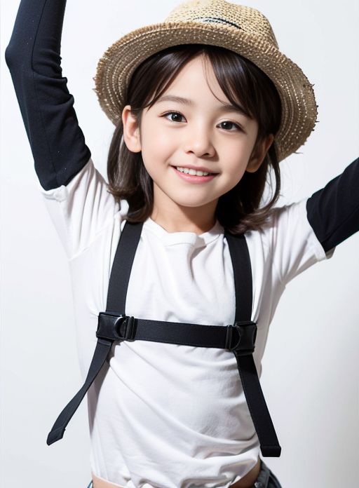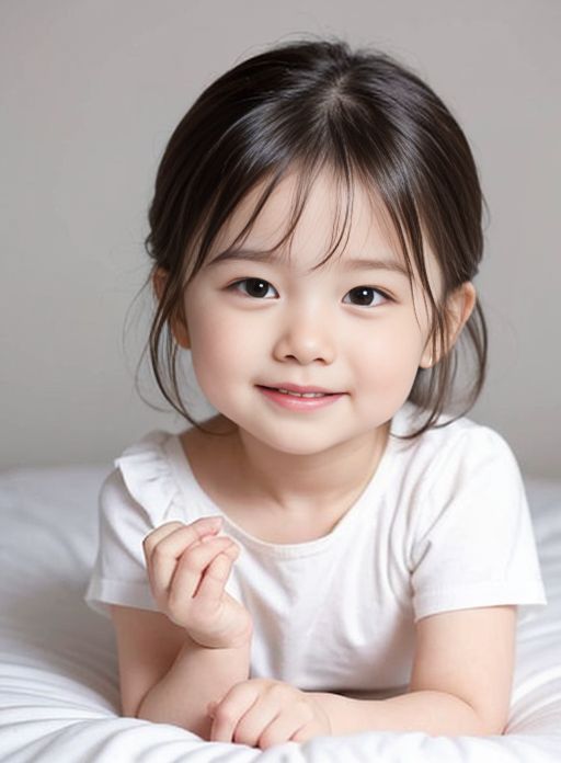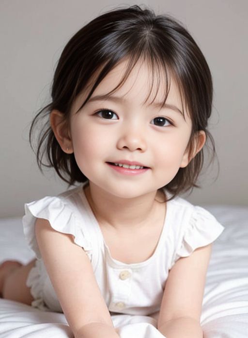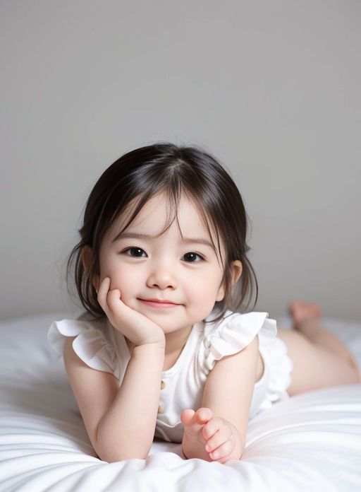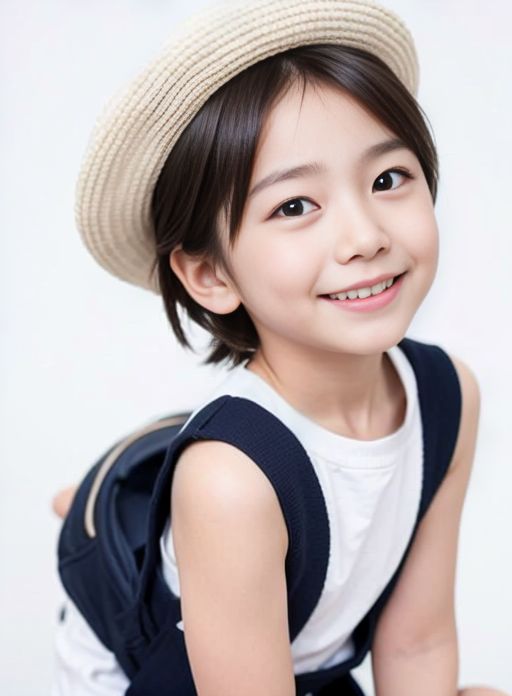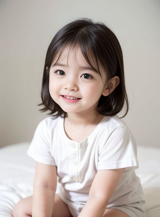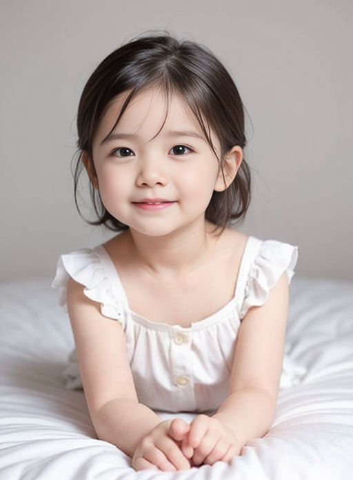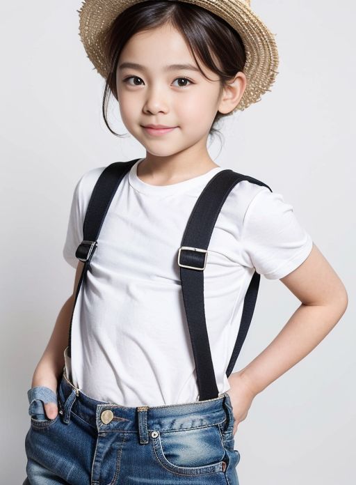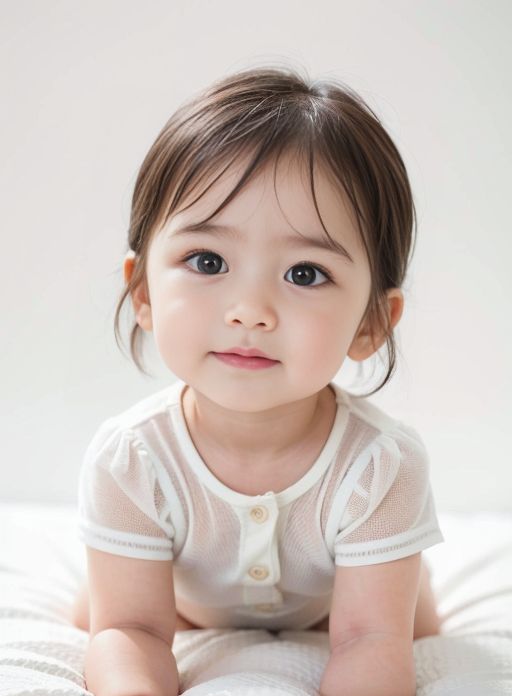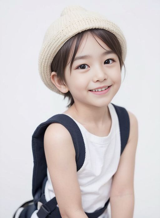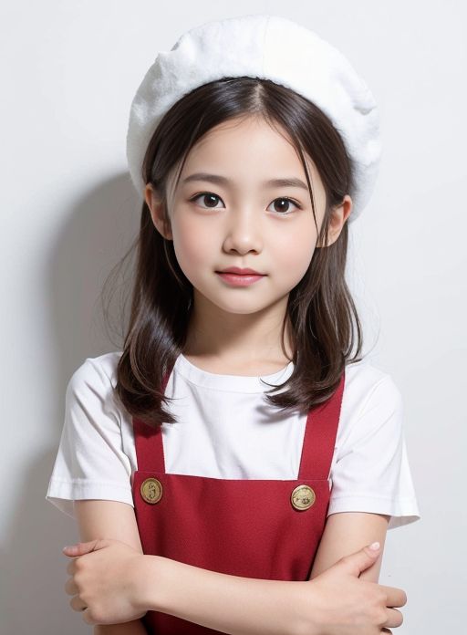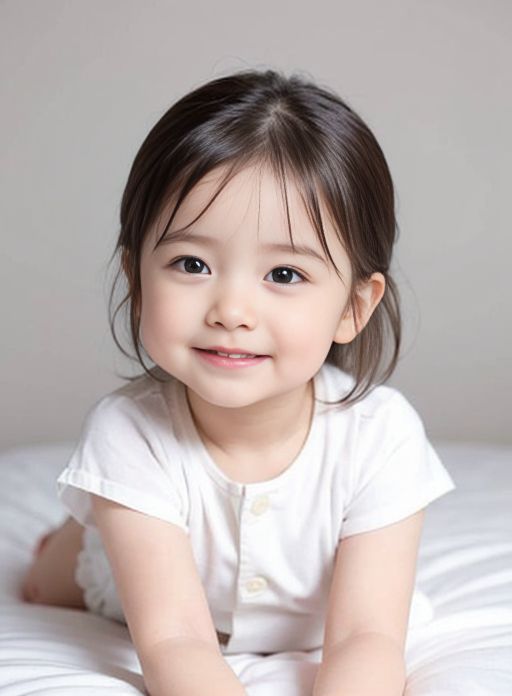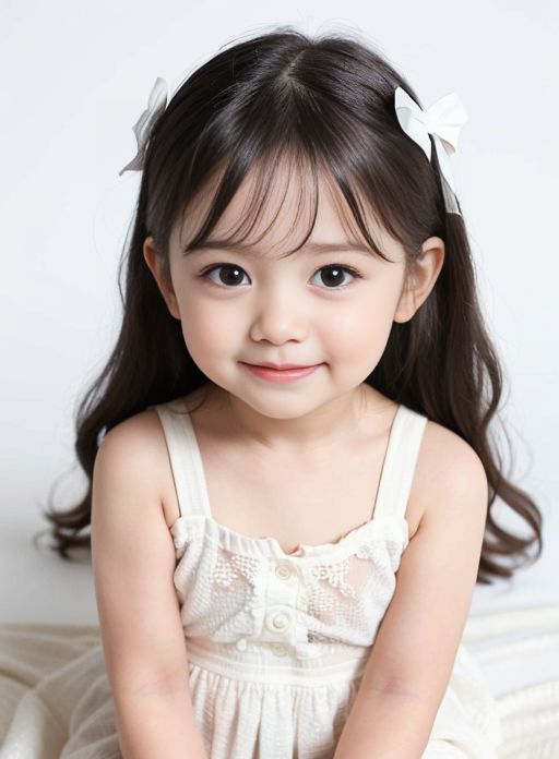 The background should be a clean and pristine white studio backdrop, symbolizing purity and simplicity. This allows the focus to remain on the child model’s endearing features and vibrant personality without any distractions.