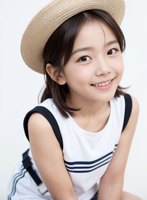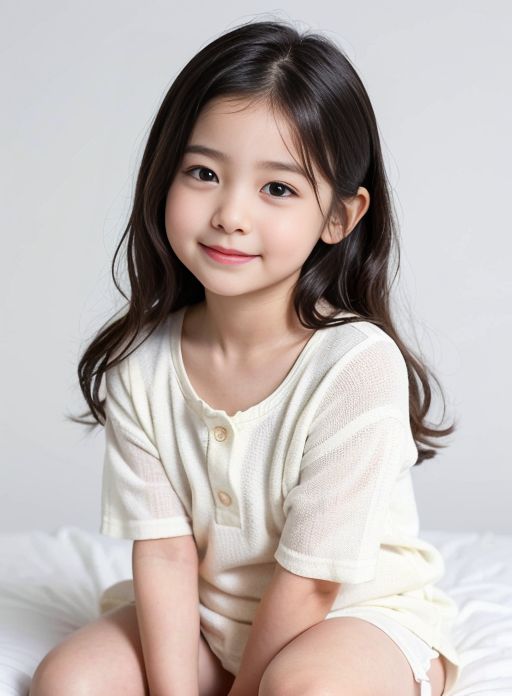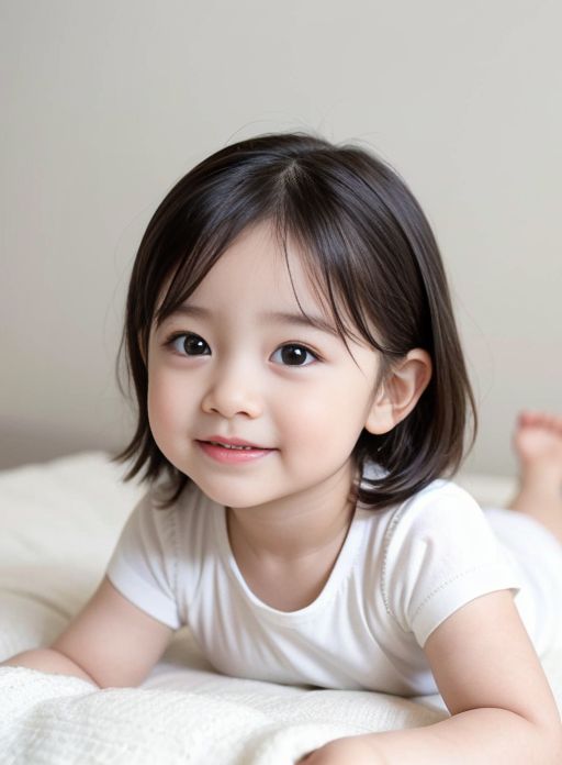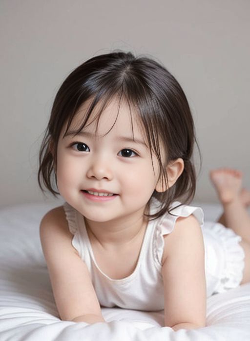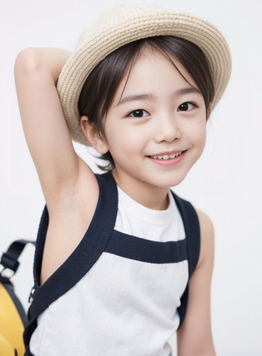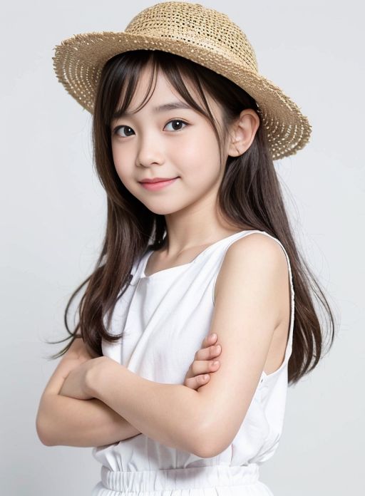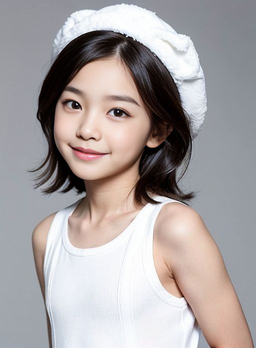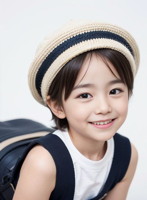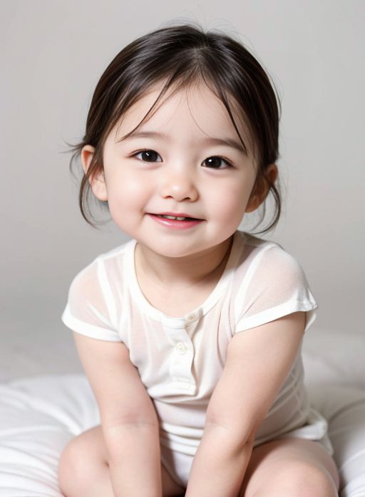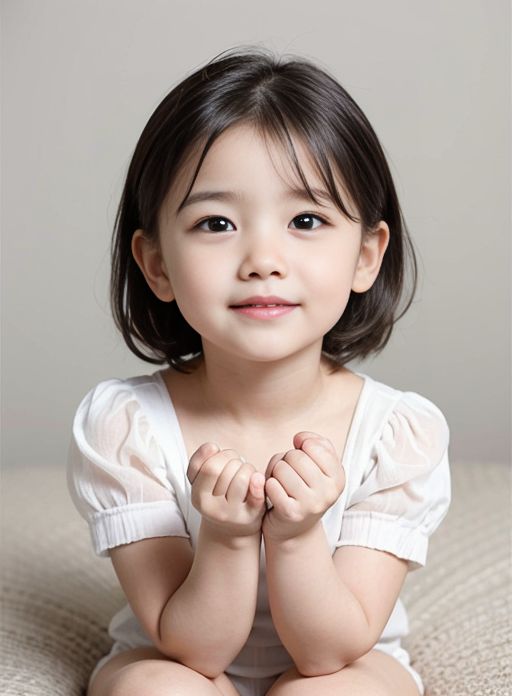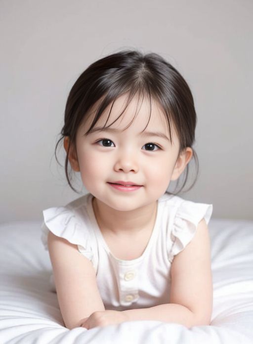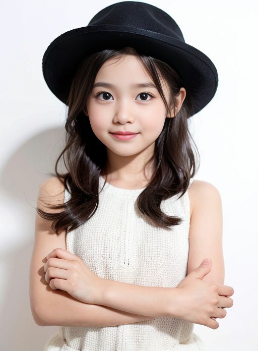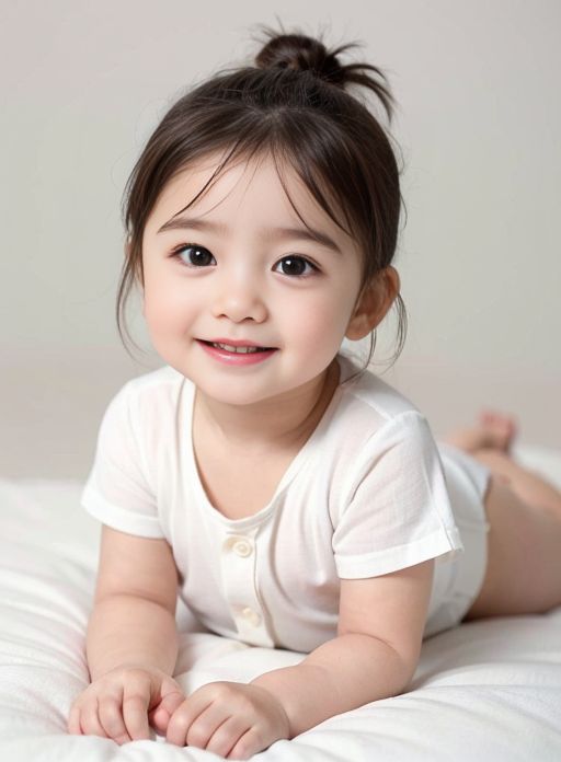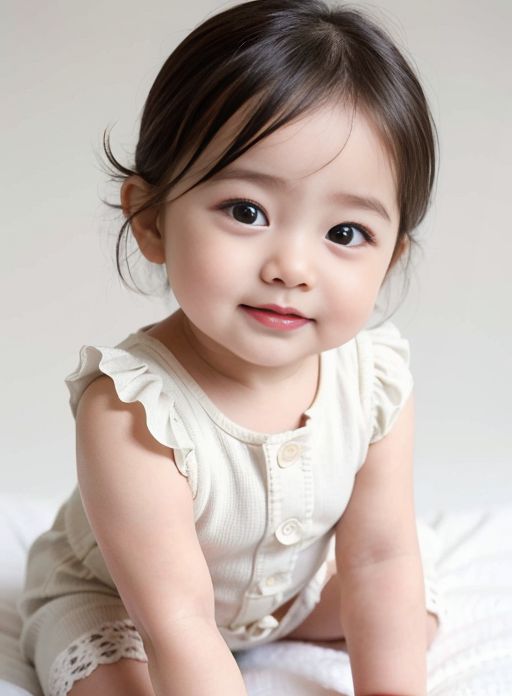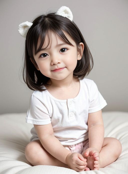 The background should be a clean and pristine white studio backdrop, symbolizing purity and simplicity. This allows the focus to remain on the child model’s endearing features and vibrant personality without any distractions.