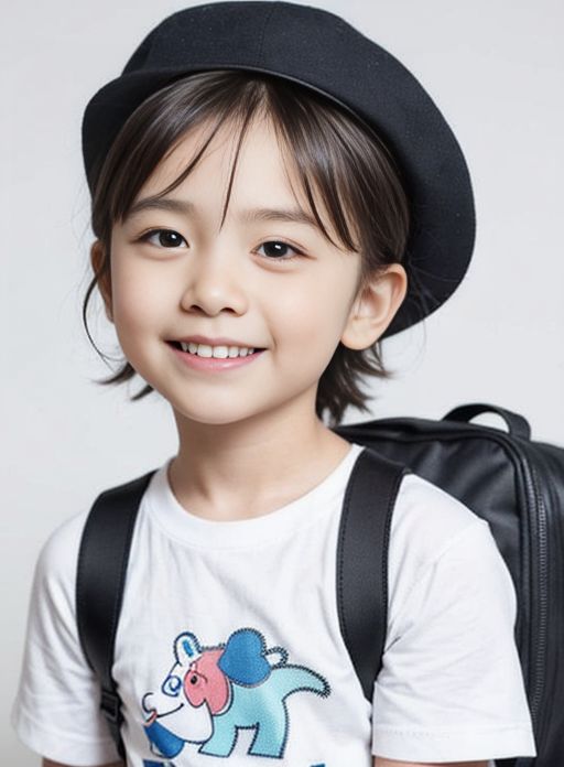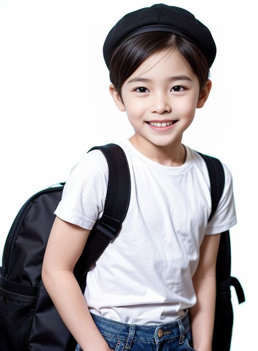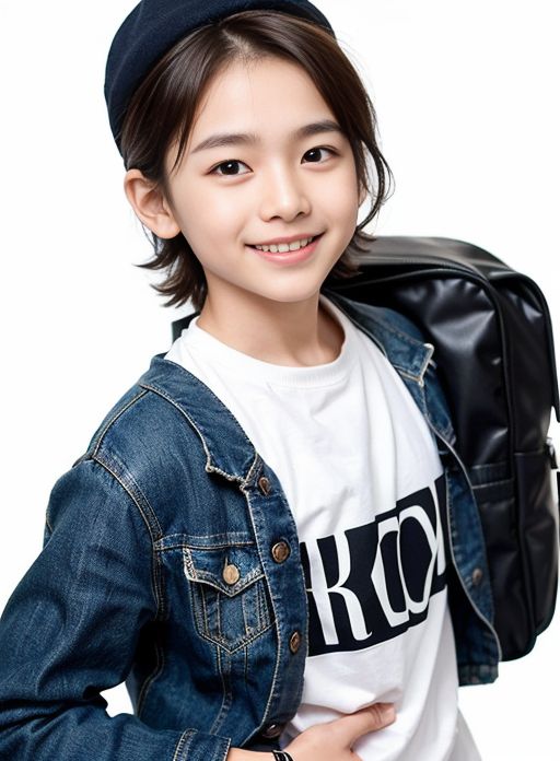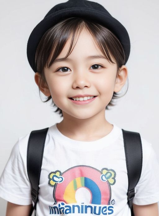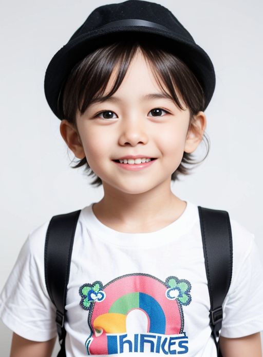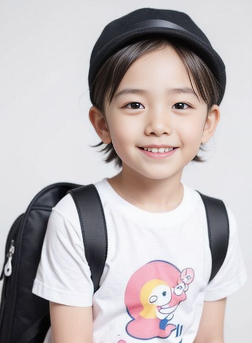 Dressed in fashionable yet child-friendly clothing, the young model wears a stylish and age-appropriate outfit that suits his personality. The attire should feature bright colors and fun patterns, reflecting his lively and joyful spirit. To add a touch of playfulness, he could be wearing a favorite accessory, such as a cool hat or a fun backpack.