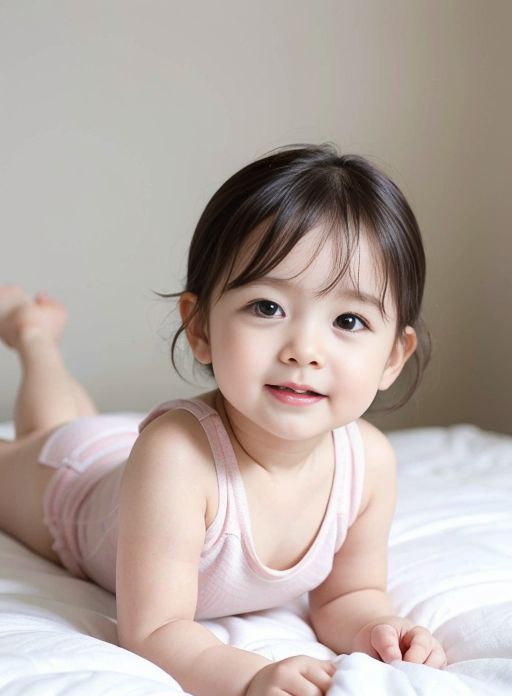 The baby model poses in a heartwarming and natural position, perhaps sitting on a soft blanket or lying down comfortably, displaying a sense of pure delight and tranquility. Their facial expression should be filled with innocence and happiness, capturing the hearts of viewers.